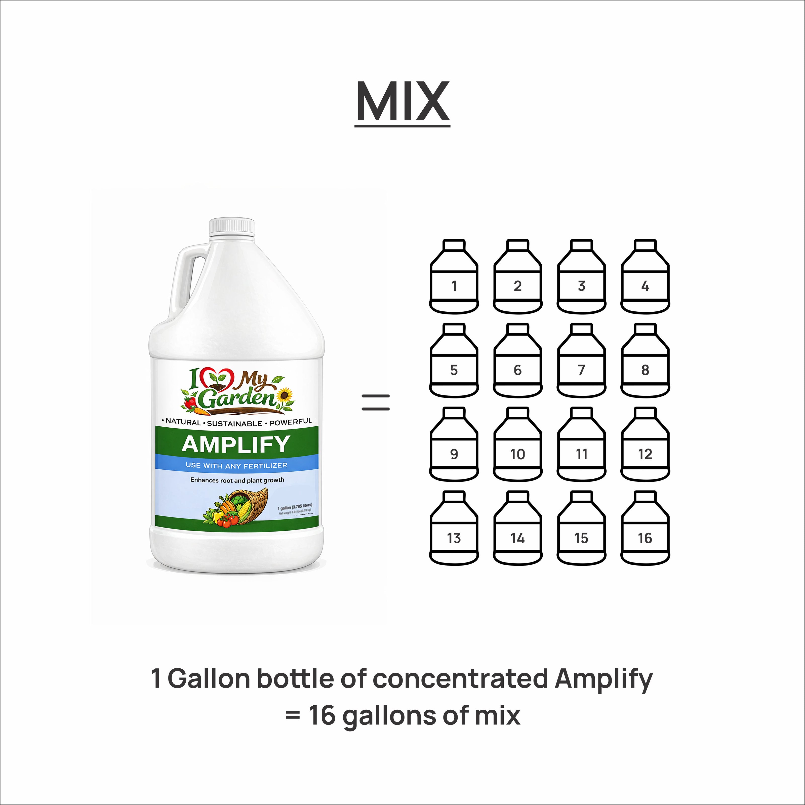 Blend 8 ounces of Amplify with 1 gallon of water in a standard garden sprayer or watering container. 1 Gallon of Amplify concentrate makes 16 gallons of mix.